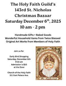 * Children’s Chapel – Is God calling you to help with this vital ministry? We are in need of chapel teachers and assistants for both the 8:30 a.m. and 11 a.m. services, with as much or little frequency as you can offer. All volunteers working with children and youth receive safeguard training. Please contact Eli parishoffice@holyfaithchurchsf.org or call the office. (505) 982-4447.